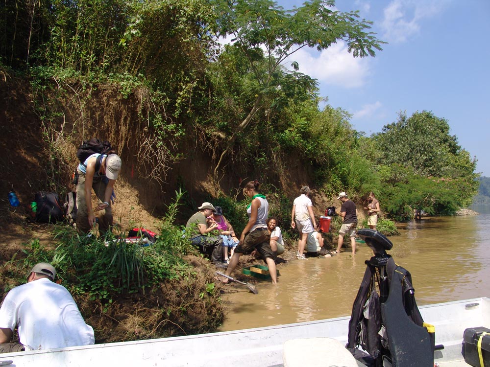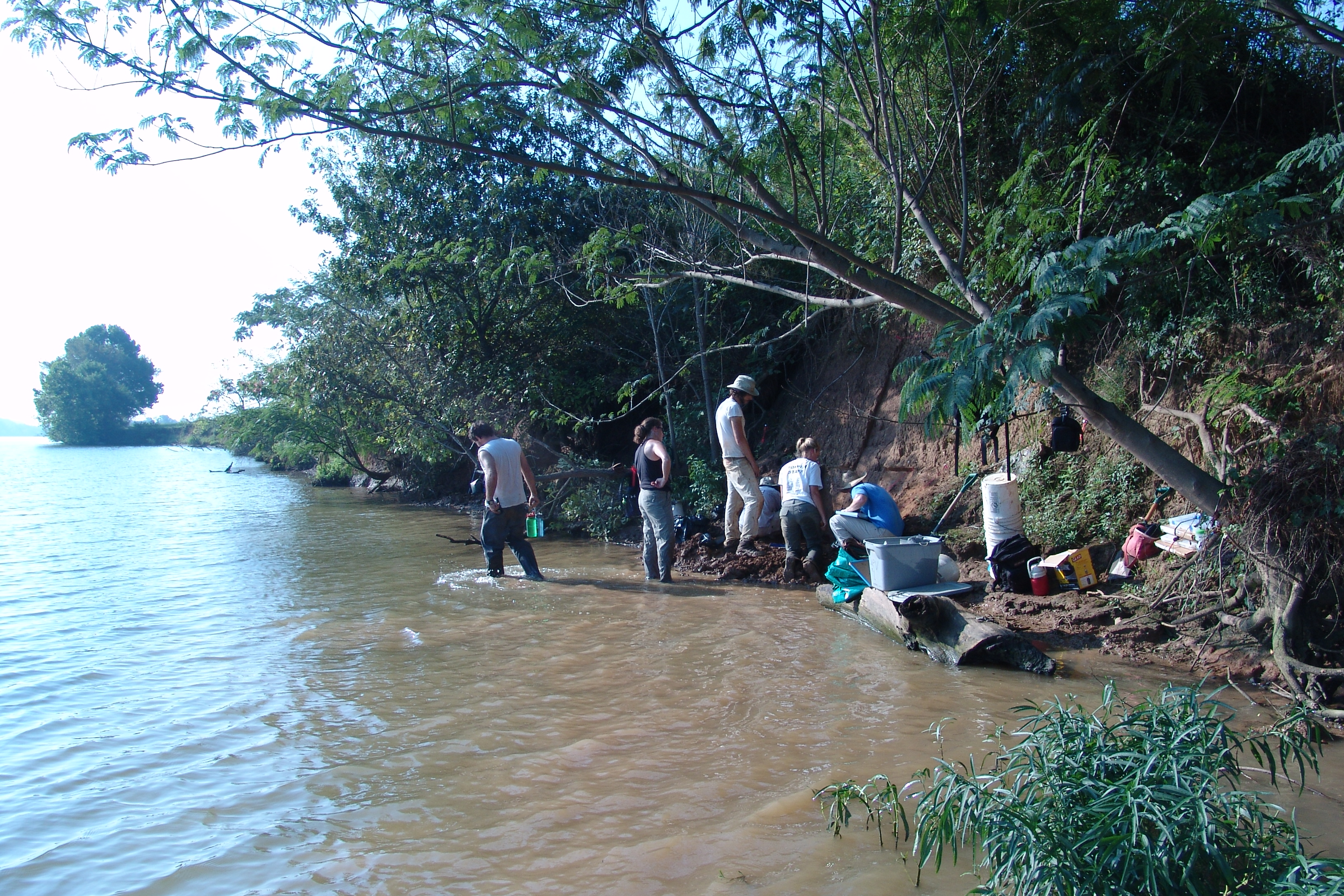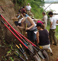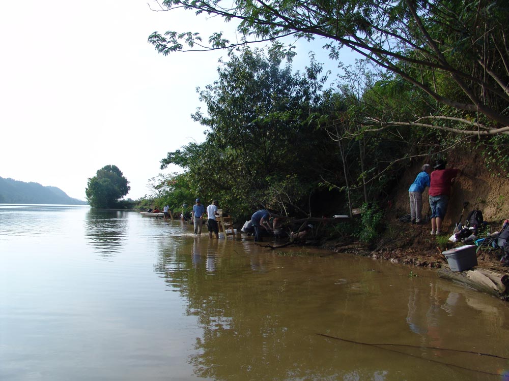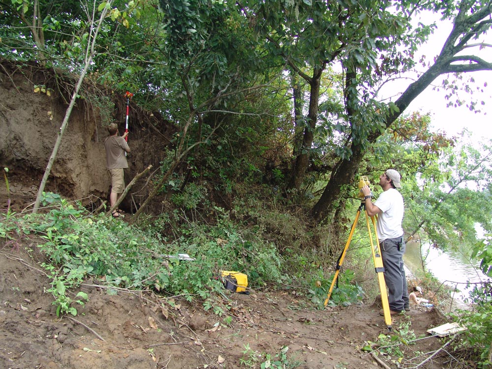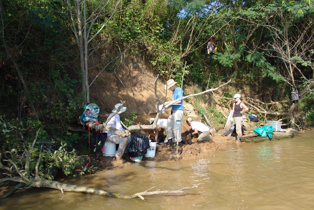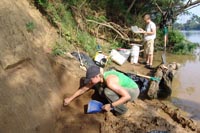 | July 30th - We continued working on the same site, with additional surface collections downriver. We completed a 3m deep float column, found additional deeply buried flakes and charcoal, and began bucket augering in an attempt to find the extent of the deposits. We also had a team using a totalt station to gather the data needed to create a 3D topographic map of the site. | |||||