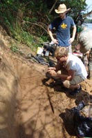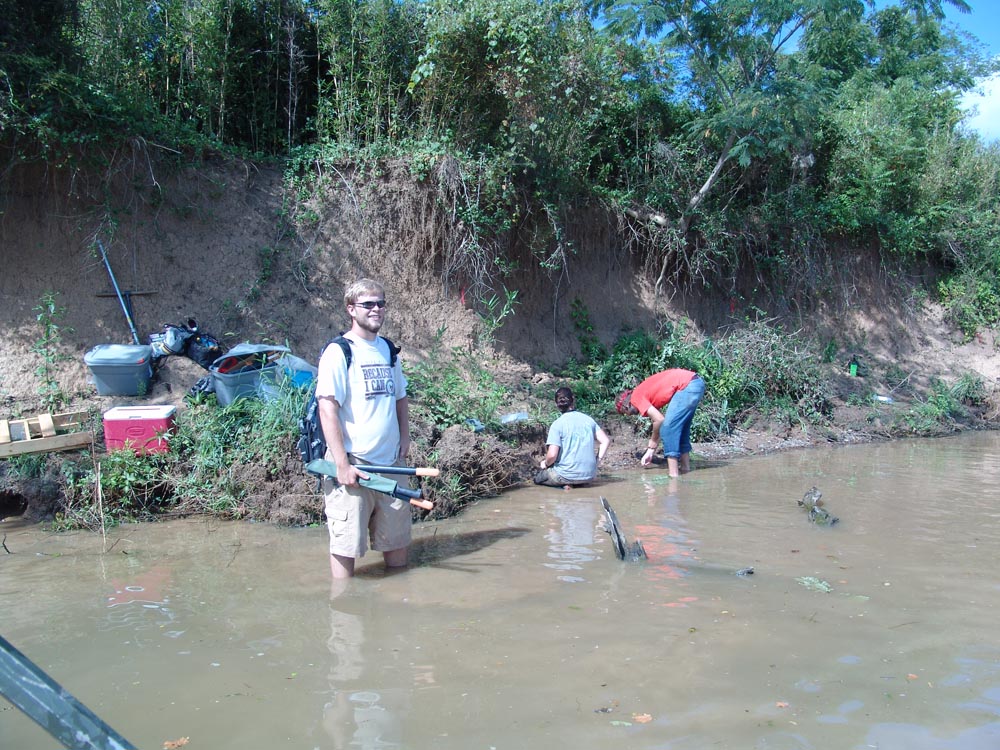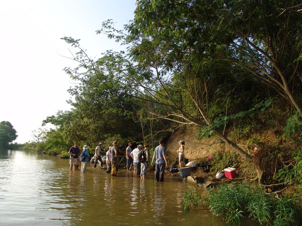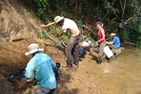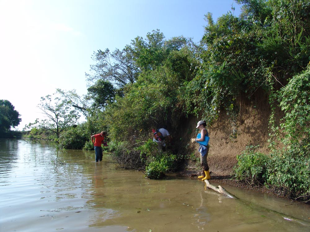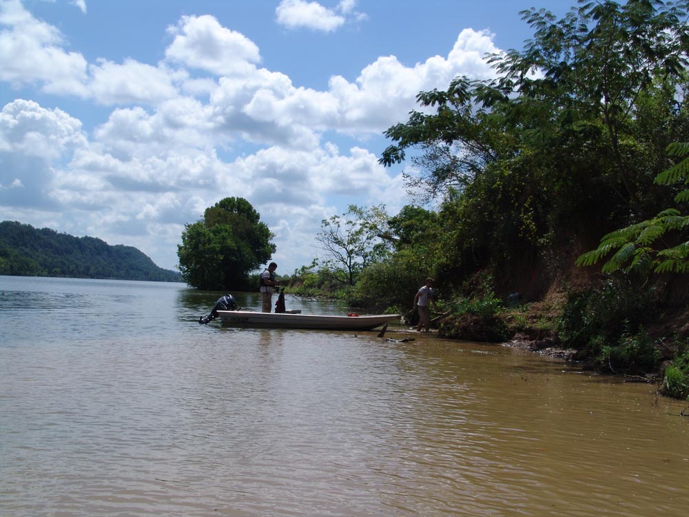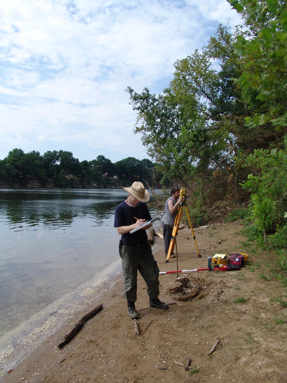 | July 30th - We continued working on the same site, with additional surface collections downriver. We completed a 3m deep float column, found additional deeply buried flakes and charcoal, and began bucket augering in an attempt to find the extent of the deposits. We also had a team using a totalt station to gather the data needed to create a 3D topographic map of the site. | |||||