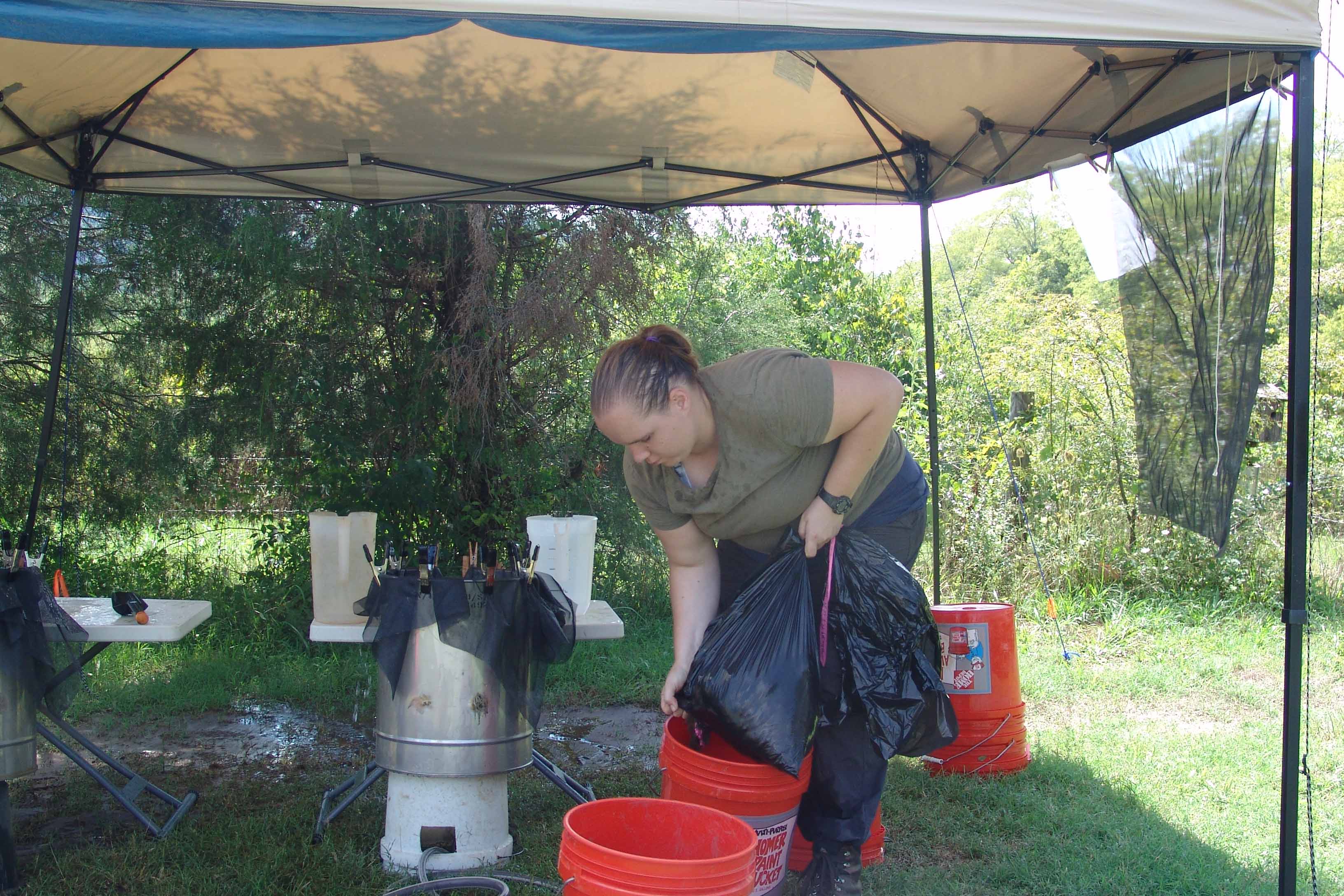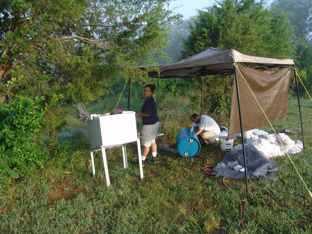 | July 19th - New week. We finished up testing at the historic house and are now re-locating and testing previously recorded sites on the property of the Bells Bend Outdoor Center. We are also investigating an additional site that is eroding into the river, and are continuing to process floatation samples. | |||||