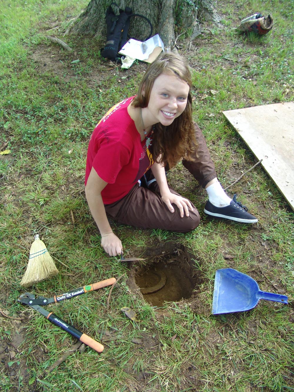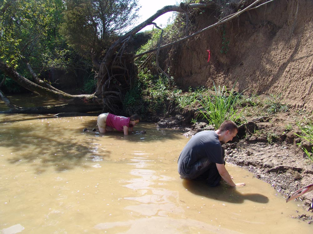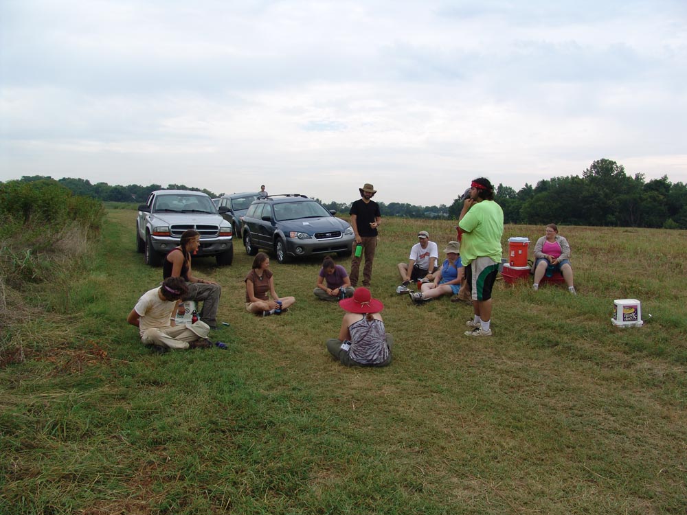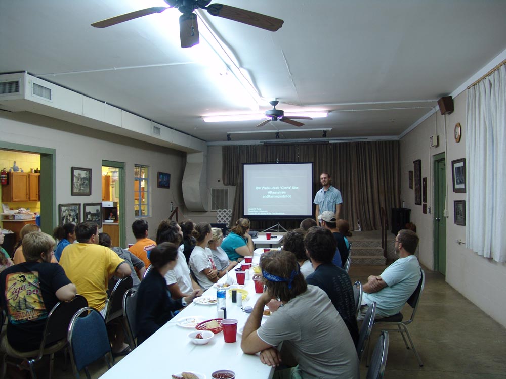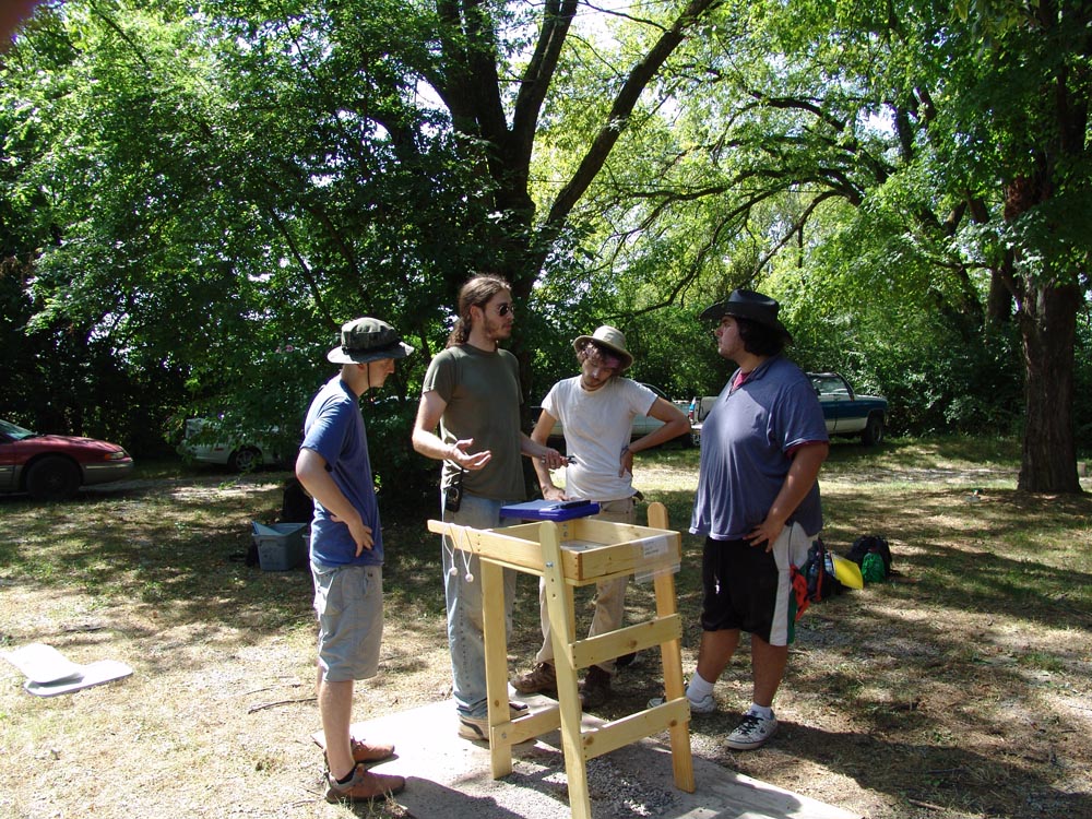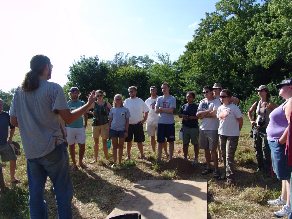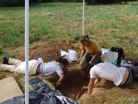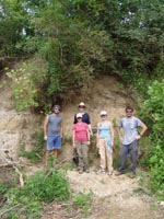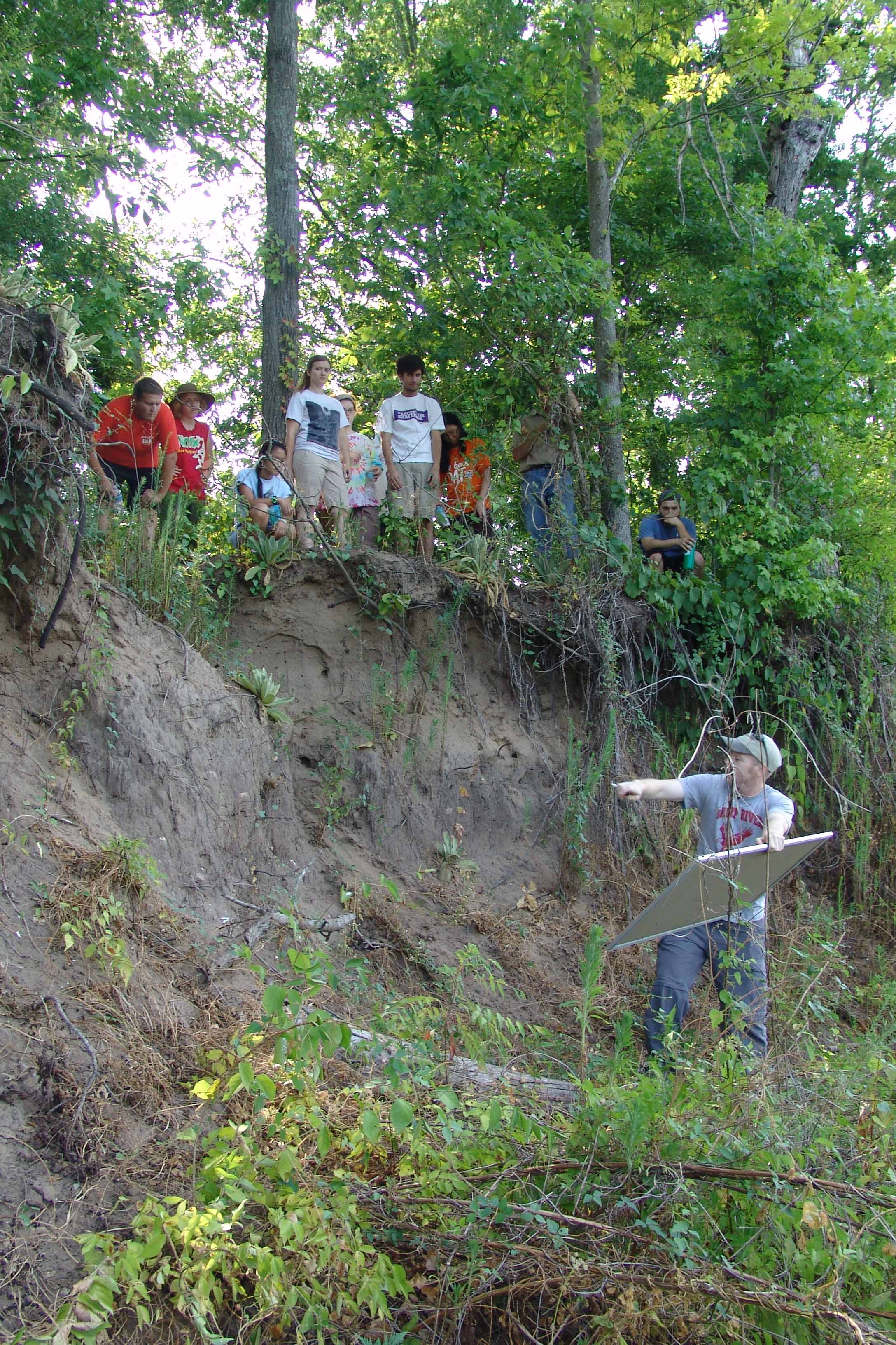 | August 3rd - Last night we listened to Jesse Tune discuss the Well's Creek Crater site. Today, we continued excavating the deeply buried flakes and charcoal we found last week. We also removed a hornet's nest and picked up a pirate hat. John Broster and Mark Norton also visited the site today. | |||||