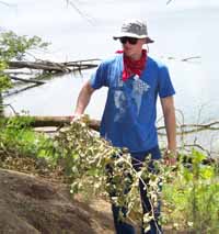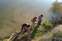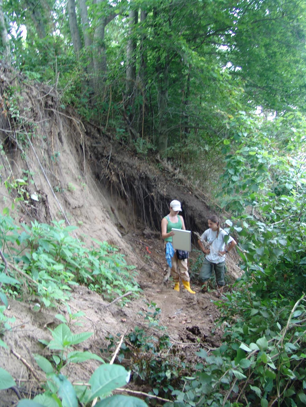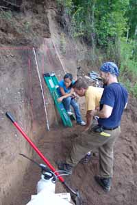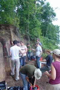 | August 2nd - We began two units at the base of the profile to continue investigating the deeply buried flakes and charcoal we found last week. We also placed several additional bucket auger tests to try to find the extent of the shell deposit and finished surface collecting the shoreline. Today we were also visited by Gary Barker and Howard Cyr. | |||||